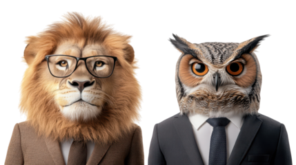 Dapper gentleman and a bespectacled lion, surreal portrait of contrasting worlds