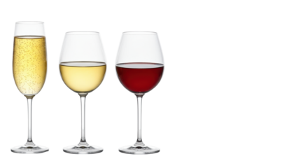Four elegant crystal glasses, precisely filled with distinctively colored liquids, on a transparent background with copy space, concept of diverse high-quality solutions