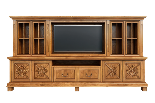 A large, wooden entertainment center with glass doors, drawers and space for a TV.