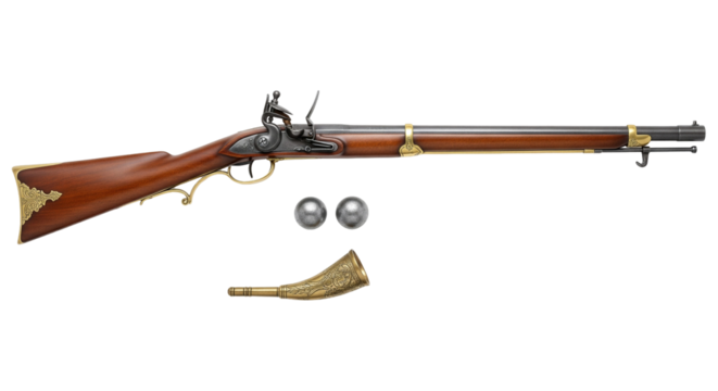 Vintage mid century brown bess flintlock rifle with ornate features and historical significance isolated on transparent background