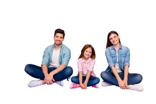 Family of three members sitting floor enjoy best company wear casual clothes isolated purple background