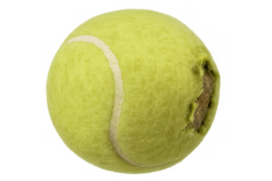 Close-up of a worn tennis ball with visible damage, isolated on a transparent background, highlighting the concept of aging and usage in sports equipment