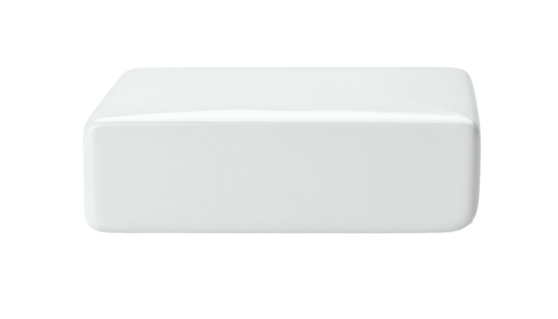 A pristine white rectangular object with rounded corners and a slightly angled front. It is isolated on a stark black background