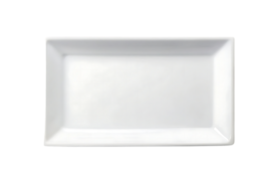 White rectangular ceramic tray with beveled sides and sleek contemporary minimalist restaurant design, isolated on a transparent background