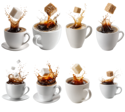 Dynamic visual series of sugar cubes splashing into hot dark coffee within eight distinct white cups, illustrating energetic beverage preparation