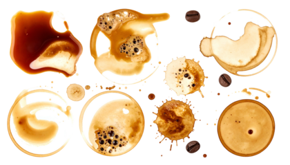 Isolated coffee stains and splashes against black background, various shapes and sizes