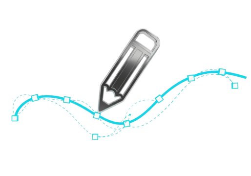 Detailed 3d render of a metallic digital pencil tool interacting with a bright cyan bezier curve, precise anchor points, and control handles, isolated on a transparent background. Concept of digital