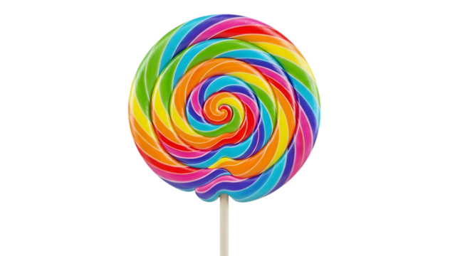 A colorful spiral lollipop with vibrant stripes of red, orange, yellow, green, blue, and purple on a black background