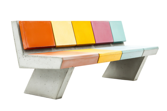 Modern concrete public bench with colorful orange yellow pink and blue seat panels contemporary outdoor street furniture design isolated on transparent background