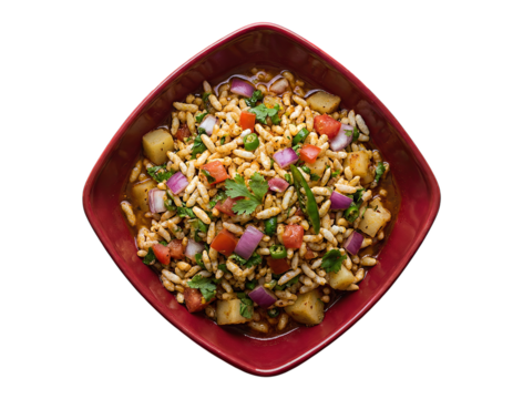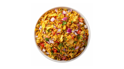 A colorful serving of bhelpuri, a tangy and spicy Indian street food made of puffed rice and chutneys, studio view, isolated on transparent background.