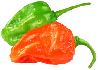 Three fresh red Ghost Peppers, Bhut Jolokia, one of the hottest chilies. Isolated on transparent background, png