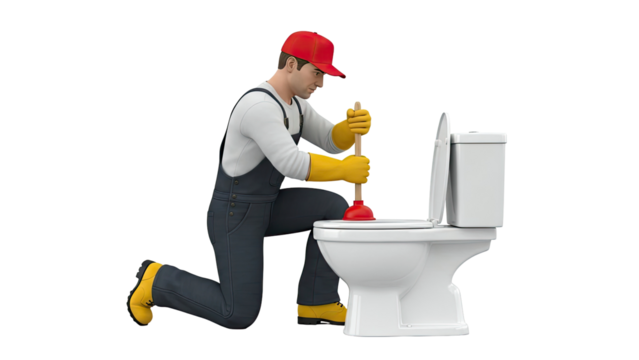 Transparent image of plumber holding plunger and toolbox in blue overalls