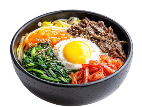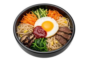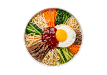A healthy and colorful korean bibimbap dish with rice vegetables and egg yolk isolated on transparent background