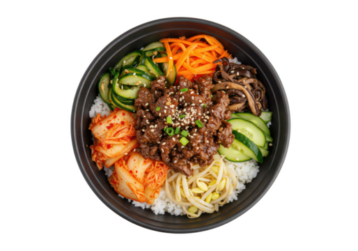 A top view of a Korean bibimbap bowl featuring cooked rice topped with colorful ingredients isolated on transparent background