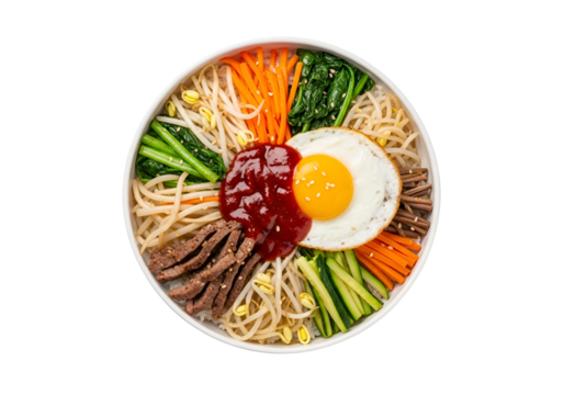 A vibrant korean bibimbap bowl is artfully arranged with fresh ingredients and a sunnysideup egg on transparent background