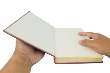 Hands holding Holy Bible. Cross on a dark cover book. Sacred scripture. Isolated background