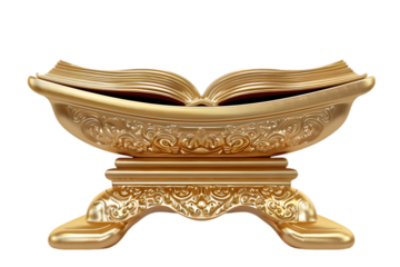 Holy Quran on stand, open book on gold metal holder, isolated on transparent. Islamic religion