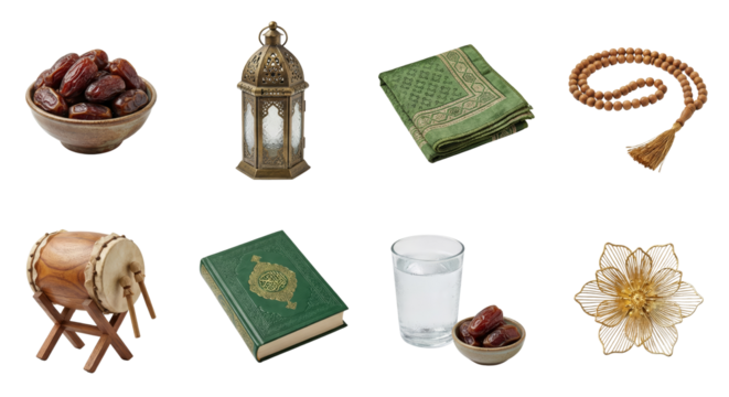 Ramadan Symbols: Dates, Lantern, Prayer Mat, Quran, Beads, Drum, Water