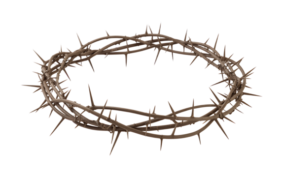 A rustic crown of thorns, meticulously crafted from thorny branches, representing suffering, sacrifice, and the passion of Christ on a transparent background. background removed