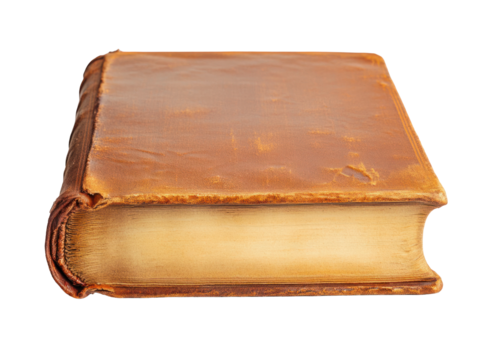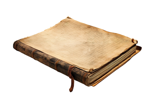 Ancient, Weathered Leather-Bound Book With Fragile Pages Resting on a Rustic Wooden Surface on Transparent PNG Background.