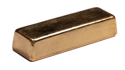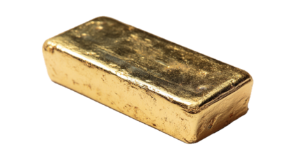 Un lingotto d'oro rettangolare, con superfici lisci e brillanti è mostrato su sfondo bianco trasparente.
