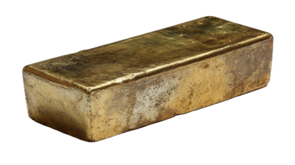Lingotto d'oro su sfondo bianco trasparente. E' un blocco di forma rettangolare, con superfici lisce e segni di ossidazione che gli conferiscono un aspetto realistico e grezzo.