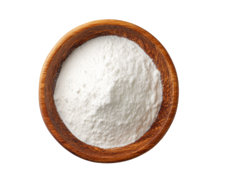 White powder ingredient filling glass bowl, baking soda or flour for cooking on transparent background