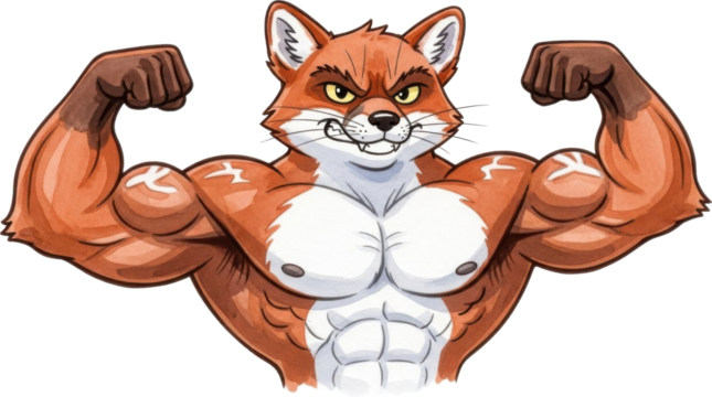 Muscular cartoon fox flexing muscles isolated on transparent background