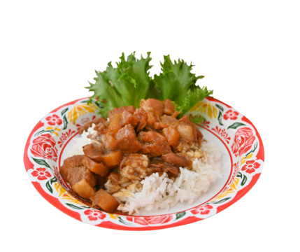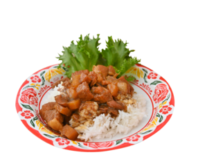 Bicol Express Stew in plate with rice  table top. Filipino cuisine spicy pork belly coconut milk curry. Asian food.