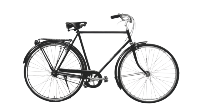 Yellow bicycle, side view. Black leather saddle and handles. Png clipart isolated on transparent background