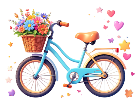 Cartoon Style Kids’ Bicycle with Flowers in Basket, Flat Lay PNG