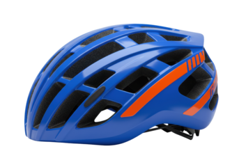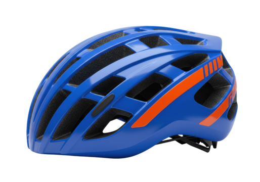 Blue and orange bicycle helmet isolated on transparent background, safety gear for cycling and outdoor sports