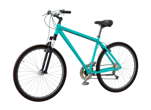Blue bicycle, side view. Black leather saddle and handles. Png clipart isolated on transparent background