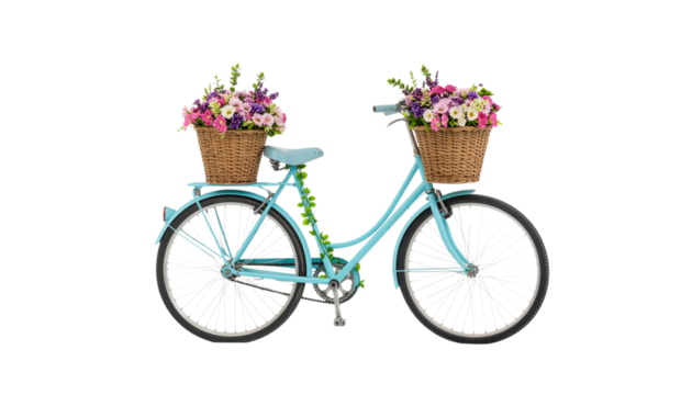 Transparent retro bicycle with basket of vibrant flowers