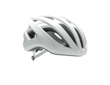 Sleek white bicycle helmet, side view on black background, with vents and straps