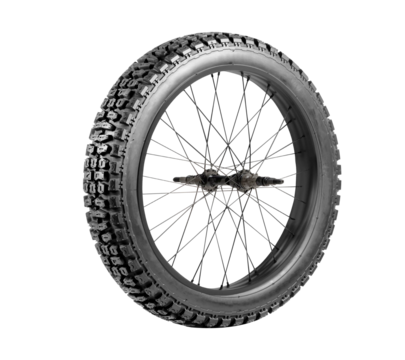 Closeup, mountain bike front wheel tire, suspension fork, and offroad ready detail