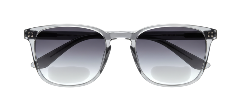 Stylish clear frame bifocal gradient sunglasses feature a modern design with dark to light lenses and visible reading segments, presented in a precise, eye-level studio shot