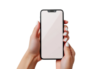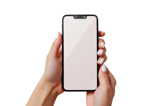 hand with great color nail design holds big phone with white screen iphone 13 flat view white background for website. transparent bakcground. PNG