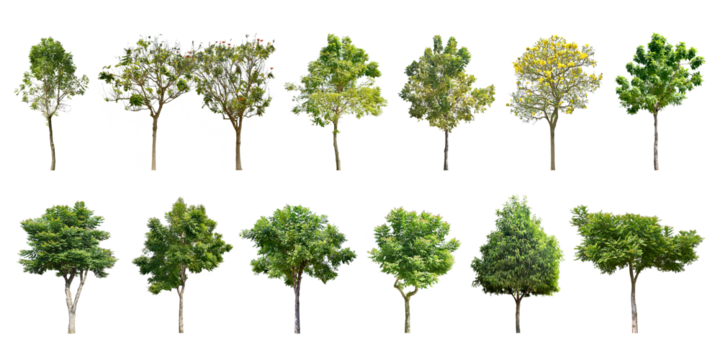 Collection of green trees isolated on transparent background. for easy selection of designs.