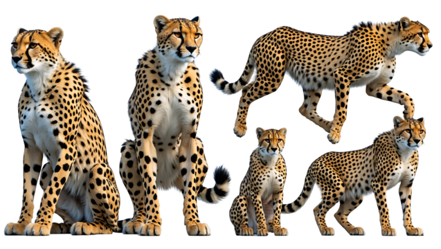 A set of cheetahs in different poses isolated on transparent background, high-quality PNG collection of fast and agile big cats