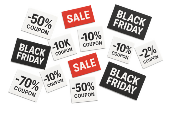 Two black friday sale stickers with special offer and big sale text on a transparent background isolated on transparent background