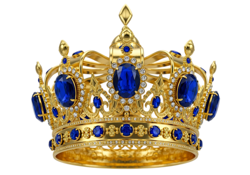 Ornate golden crown adorned with large blue sapphires and small diamonds isolated on a transparent background