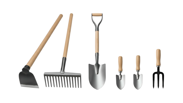Collection of gardening tools, including a hoe, rake, shovels, and trowels, on a black backdrop