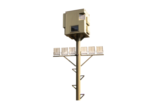 Large spotlight box pole isolated on cut out PNG or transparent background.Technology that provides light in wide area. Beautifully shaped set in park to illuminate night. Safety floodlight on road.