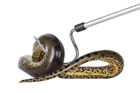 Handling a young Green Anaconda aka Eunectus murinus snake. Isolated cutout on transparent background.