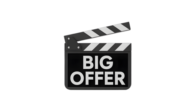 A movie clapper with a big offer sign on a black background