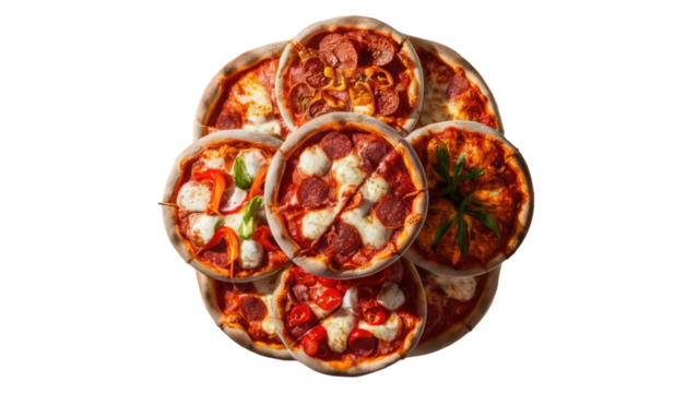 A large set of delicious pizzas with various toppings isolated on a transparent background. A top-down view of the large collection of pizzas