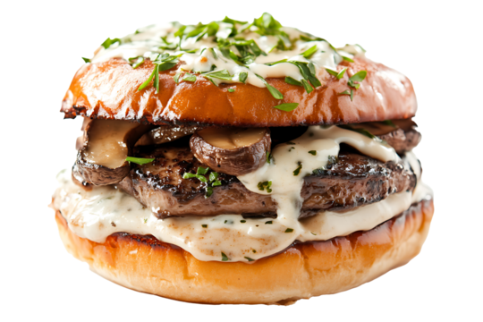 Hearty steak and mushroom sandwich with fresh lettuce and tomato isolated on transparent background. Delicious sandwich isolated on white background.