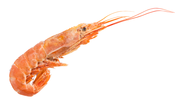 Large raw shrimp with curved body and prominent black eye against white, isolated on a transparent background