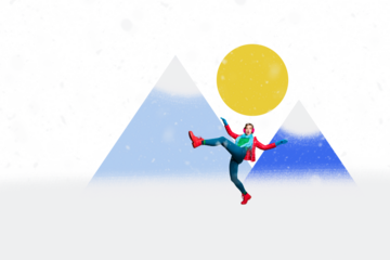 Composite photo collage of astonished girl fall slippery snow winter walk big snowdrift mountain season isolated on painted background